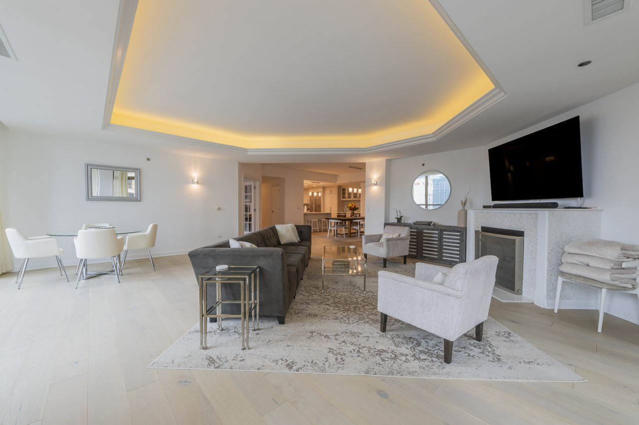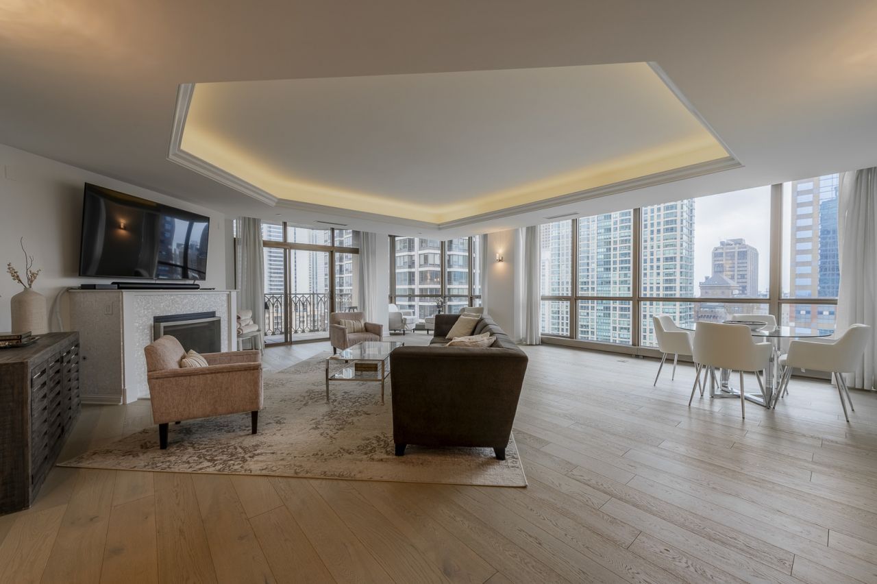Discover unparalleled luxury living at The Pinnacle. This absolutely stunning, completely renovated unit features 3033 square feet, 3-bedrooms plus den, 3.5 baths and 2 balconies. Meticulously renovated in 2022, the owners enhanced the original design with an expanded den, walk-in pantry, bar area, additional kitchen counter space, extended 2nd bedroom to accommodate a king-size bed and added multiple pocket doors to expand living space. Other newly added renovations include hardwood floors throughout, custom lighting fixtures, custom window treatments, Sub-Zero/Wolf appliances, wood cabinetry in kitchen and all bathrooms, quartz countertops in kitchen and bathrooms, wine and beverage fridges, extra fridge in walk-in-pantry and natural gas BBQ line and BBQ on the balcony. This unit has floor to ceiling windows with breathtaking views of the North, West, and East skylines offering an abundance of natural light. Primary bedroom features a walk-in closet, sitting area, office space and ensuite bathroom with a double vanity, oversized separate shower and whirlpool tub. The additional 2 bedrooms have their own ensuite bathroom with designer plumbing fixtures and wood cabinets. Additional features include two side-by-side parking spaces INCLUDED. Full amenity building including 24hr door-staff, indoor pool, movie theater, fitness center, game room/library, sun deck, sauna, steam room, dog run and more! Storage included.